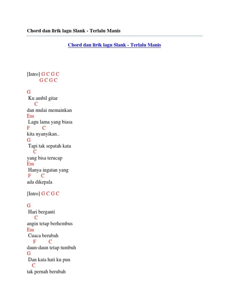 G c kuambil gitar dan mulai memainkan. Em f c lagu lama yang biasa kita nyanyikan. G c 4x g c kuambil gitar dan mulai memainkan em f c lagu lama yang biasa . Chord gitar dan lirik lagu terlalu manis slank ~ lagu dengan lirik terlalu manis untuk dilupakan kenangan yang indah bersamamu tinggalah . G c tapi tak sepatah kata yang bisa terucap Lagu lama yang biasa kita nyanyikan. C#m lagu lama yang biasa. Kuambil gitar dan mulai memainkan. Em f c lagu lama yang biasa kita nyanyikan G c ku ambil gitar dan mulai memainkan. Kuambil gitar dan mulai memainkan. G c tapi tak sepatah kata yang bisa terucap lirik kunci chord gitar slank terlalu manis intro :
